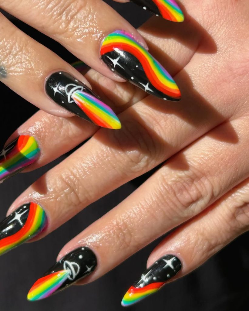 This design of nails is a charming credit to the Pride theme. The striking black base with rainbow swirls, sparkling stars, and planetary details stands out vividly. The distinct combination of the dark night-sky and the bright rainbow colors creates a galactic, futuristic feel. This set is for people who prefer something with a twist yet want to stick to the theme of Pride Week. It can be a stunning fashion piece for the lovers of Disney or the ones who dream of the cosmos. Therefore, it can be worn to various events such as parties, camping, and music festivals, making it a fantastic option.