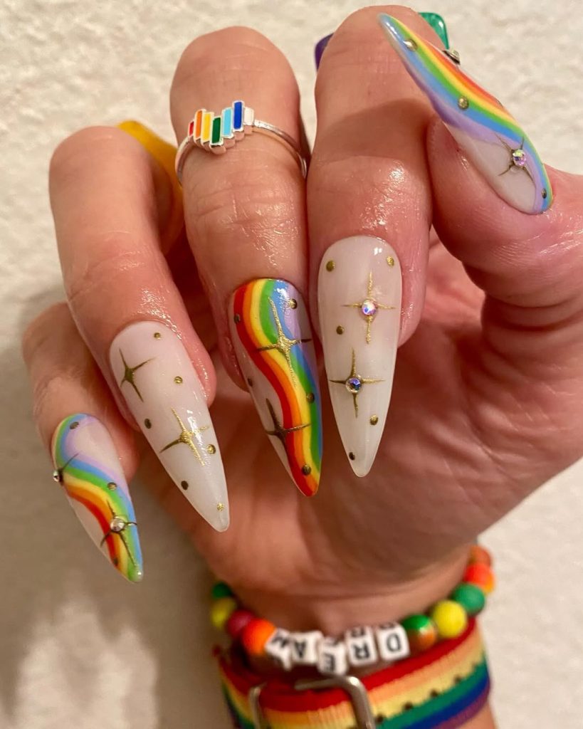 This design presents a unique charm to pride nails that are hardly noticed yet full of magic at the same time. The main semi-transparent white base is decorated barely by tiny rainbow arches and gold star tokens, including rhinestones, which are additionally add on. The nail art/program is all about asymplicity which is cute even if it is a little difficult to believe it. An angelic almond shape of nails illustrates luxuriousness that is seen by the eye only with the presence of golden-colored particulars. These artworks can be matched perfectly with casual wear and gold jewelry.
