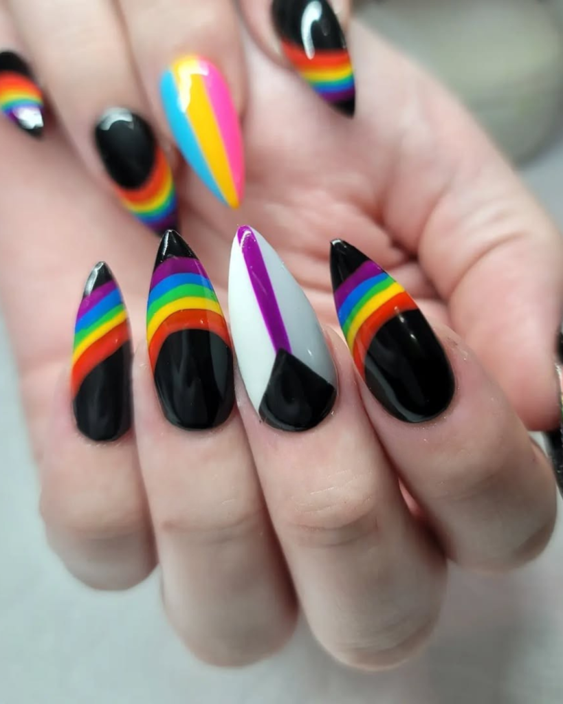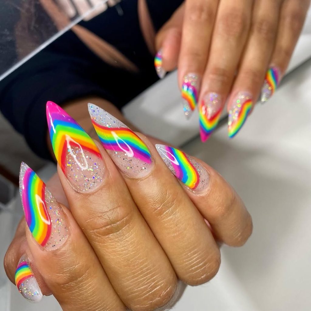 A brave mixture of styles, this manicure patches rainbow waves and a bold leopard print accent. The matte finish is an edgier variant, making it a different vision of Pride nails. The leopards’ spot earthy tones are a beautiful contrast to the bright rays of the rainbow, creating a sexy, trendy piece. This design is a must-try if you enjoy making a statement with your nails.