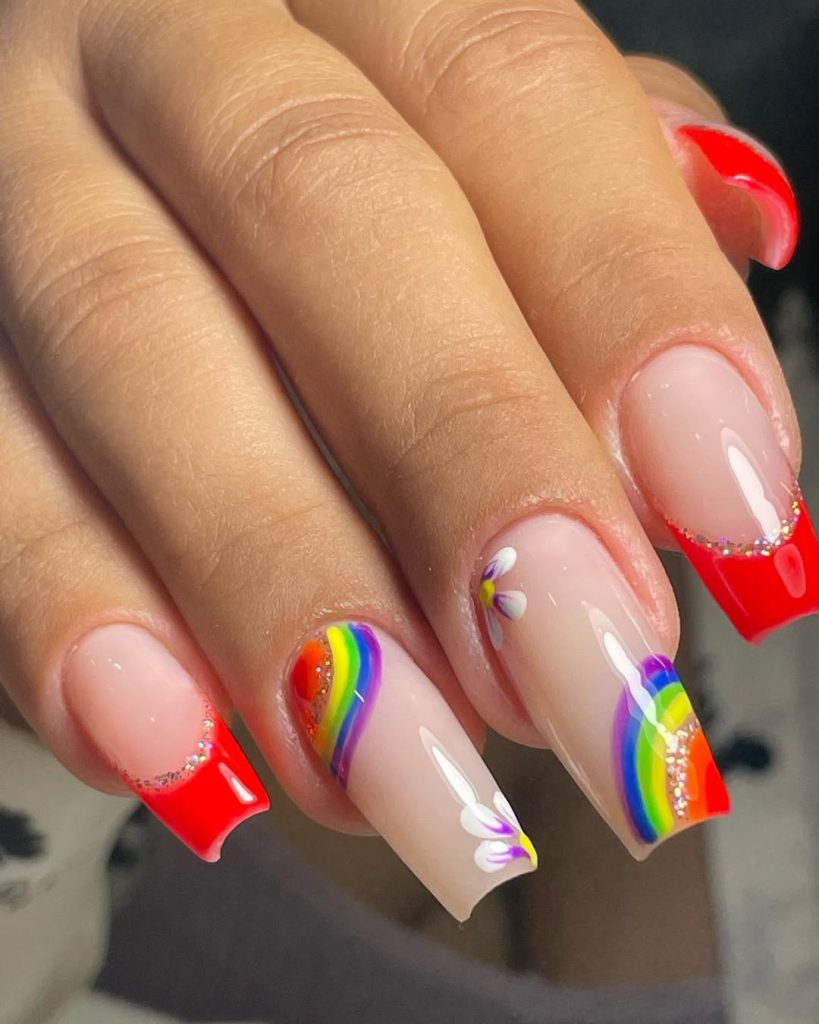 The design of French tips is taken to another level with this bold combination of classic red soft rainbow curves and delicate flowers. The straight-edge acrylic nails give a trimmed look, while the shining points on the rainbow spirals give a hint glamour. This is a good option for the people who prefer the mix of simple elegance and creative style. Summer bright attires and statement jewelry are the other options that go well with this design.