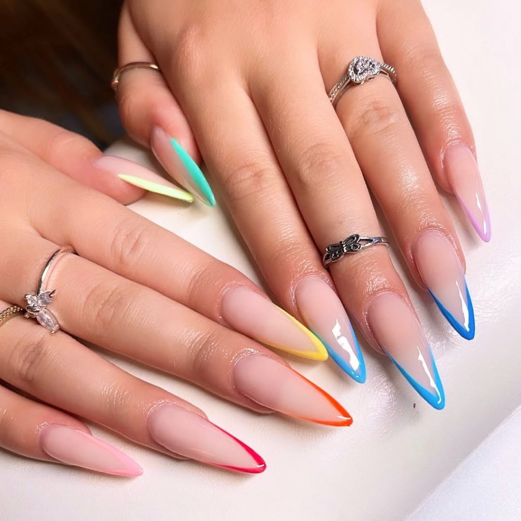 This French tip design takes a classic look and gives it a twist with a cascading rainbow arc of multiple layers. The arc tips that are bent create a graceful but striking effect, while the clean nude background permits the colors to reflect their brightness. A white line that is thin adjusts the design, making it neat and sophisticated. This set of nails is aimed primarily at those who wish to have a plain almond manicure with a super stylish and slightly artistic touch but it is still flexible enough to be suitable for both casual and classy outfits.