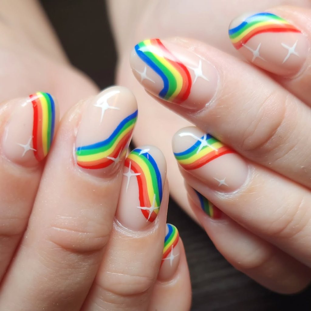 This is a great option if you are in search of a straightforward Pride nail design that can be used every day. The set includes beautiful rainbow shooting stars and lovely dots that make it a playful yet simple short style, which still delivers a strong message. The nude base not only makes the look clean and wearable but also adds colorful accents, which are both playful and fun. The design is especially suitable for the people who like the bi or pansexual flag colors that are expressed creatively and minimally.