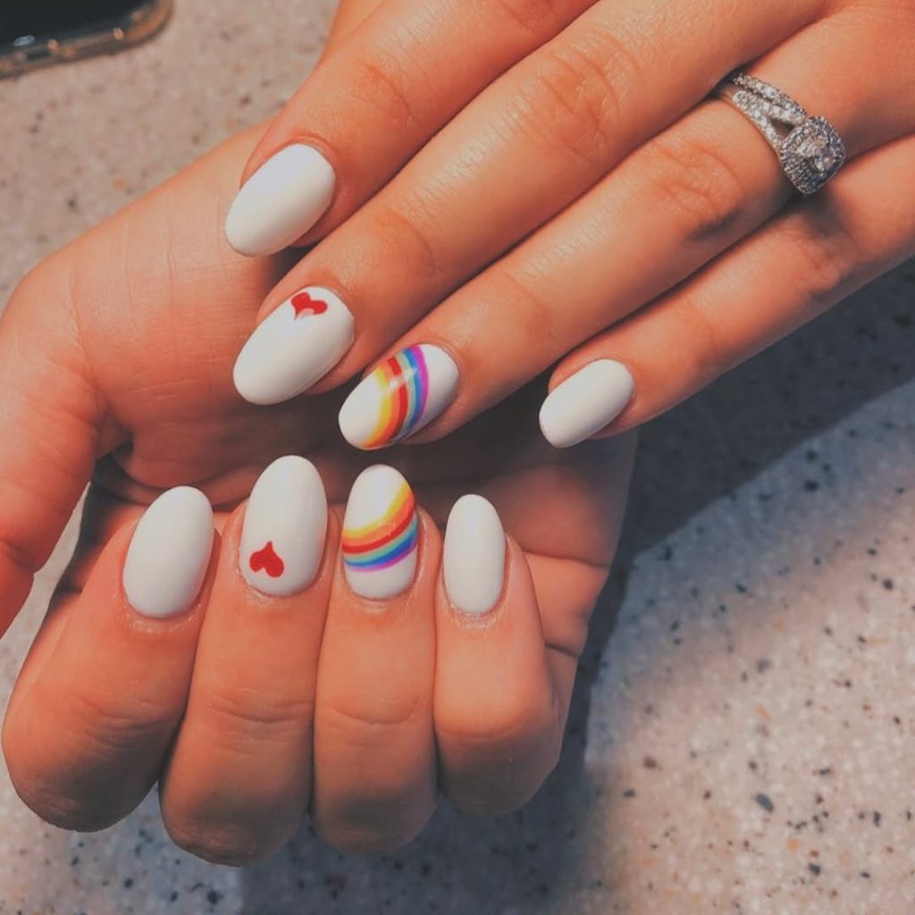 The main design of this nail art is both subtle and elegant, with a white matte base and rainbow arcs and little red hearts as accents. The design is a simple almond shape is what makes it so chic. The shiny red colors of the accent nails are so nice and bright. Turning the color of your nails in this mode is a good choice for those who feel more comfortable with less intricate, unobtrusive, but still, prideful art. You can wear it every day or to a special event.