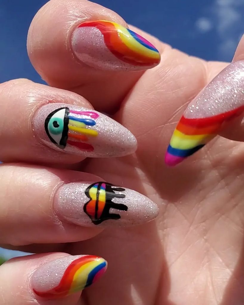 Pride nails presented in a hippie-chic style are a mix of rainbow waves, monochrome stripes, and sparkling accents reflecting a bold and vivid mood. The different designs of glitch nails juxtapose each other effectively to form a playful yet striking manicure that is absolutely unique. The shiny finish greatly amplifies the color of the vibrant palette, so it is an ideal proposal for everyone who seeks creative, easy, and catchy nails.