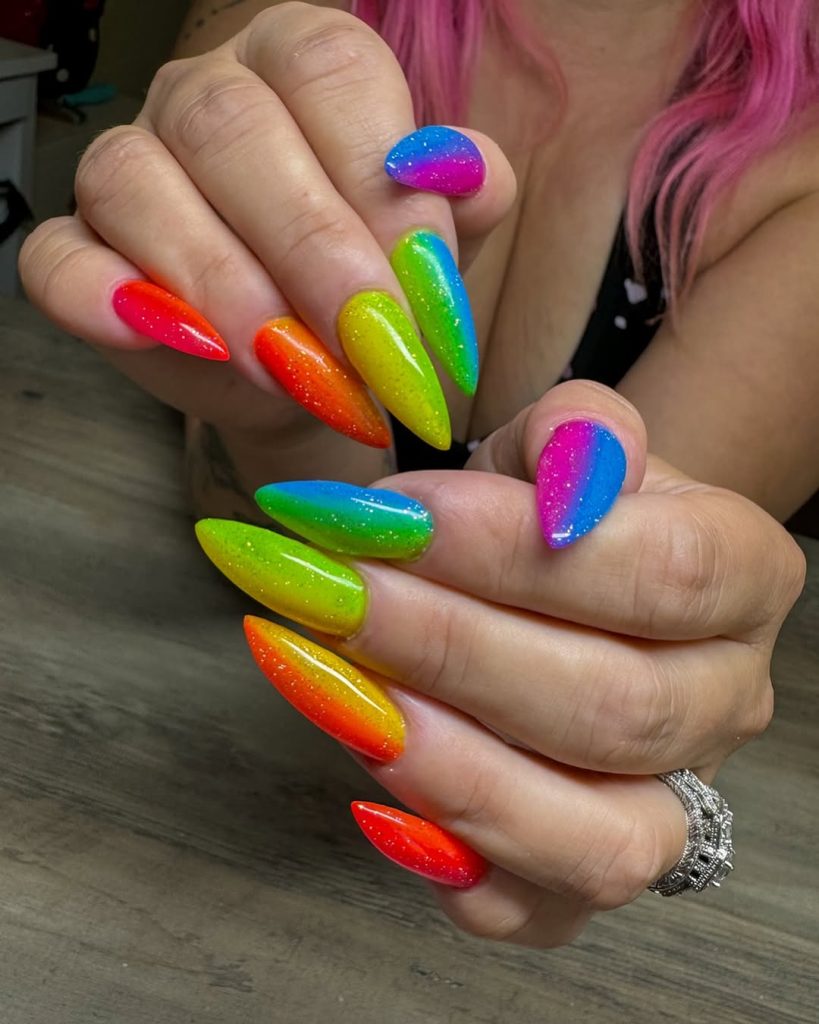 This acrylic stiletto set bright neon rainbow is simply the ultimate set and it is recommended for people who are bright and expressive. Right from the deep purple to the deep blue, the application of different colors on a single nail evokes the ombre trend.The application of fine glitter on the surface of the nails added the sparkling effect and this made the nails suitable for the pride festivals, as in, they could be worn by any individual who has an affinity for the bold, eye-catching, high-impact nail art. Describing this design, we would say that it is for those who like mainly hot colors and they want the nails to be seen by everyone.