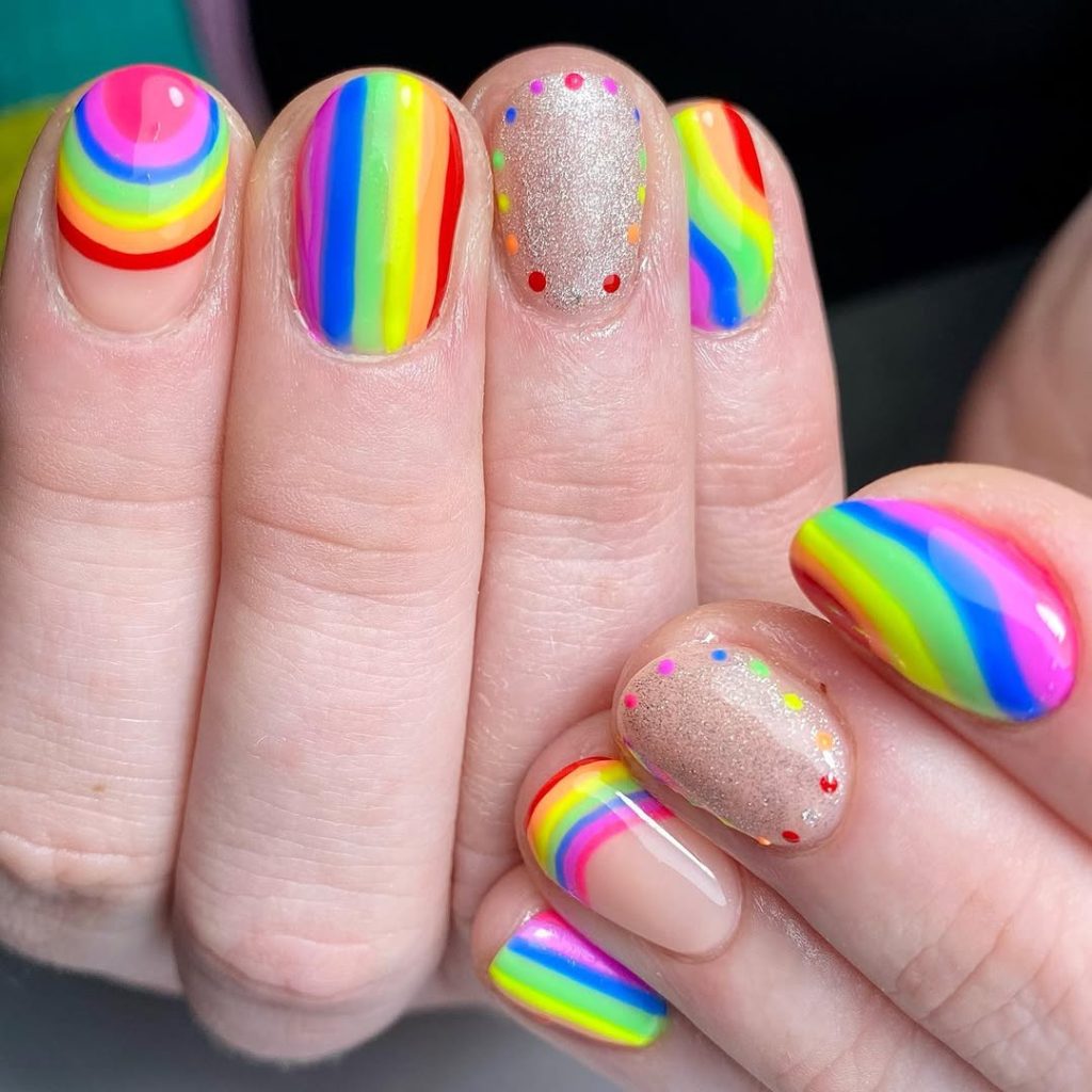 If you are short nail fanatics who still want to flaunt a colorful Pride look, then this design is the ideal mix of minimalistic and color. Browsing the power of visual illusions the arc-shaped rainbow lines sit along the edge of nails very naturally and give a dual character of shy and jocose. The high-gloss nude base which is a popular color in nail design is used as a palette for the creative idea, and creates a trendy yet relaxed feel. This means it can easily be worn on a day-to-day basis. Simply put, this is an outfit irrespective of its formality, that is, it can be a formal function or just a casual get-together; this style adds the perfect amount of Pride.