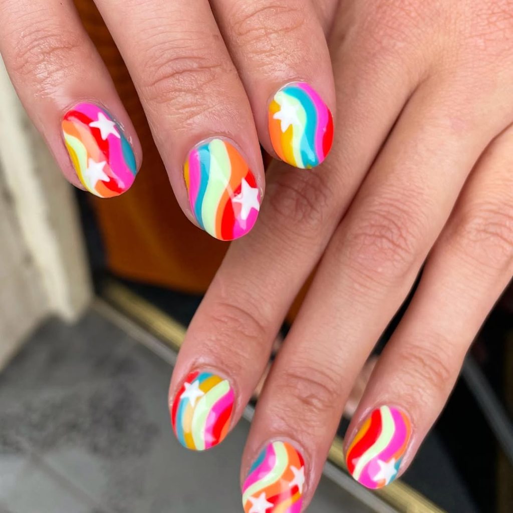 This gel nail design is a real eye-catcher for the people who adore wearing bright and colorful nails. The centerpiece of the design is the acrylic nails which are short and rounded and the model is designed with waves in the rainbow of colors red, orange, yellow, green, blue, and pink making it look like the water is flowing. The white Stars add a bit of fantasy far apart from the rest of the color. Hence, this connection becomes a suitable choice for people wanting to embrace the happiness and liveliness of Pride 2025. Anyone who loves the artistic and creative side of things can try this nail design.