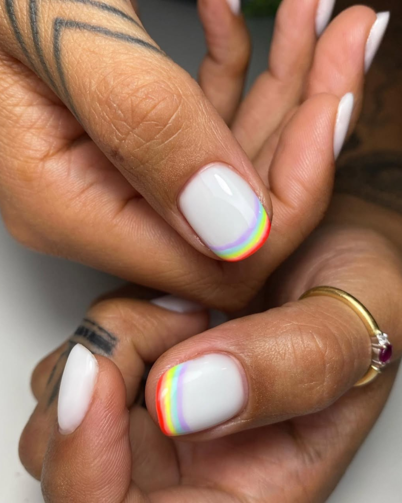 This new ideology of the classic Frenchs tip has approached this manicure in a modern and discreet way to do this. The short nails are covered with a soft, milky base of white lacquer, while the tips are done in a delicate rainbow gradient of pastel colors, which gives it a stylishly effortless appearance. For all who seek to portray their pride with a minimalist and classy touch, this straightforward design is the best choice. The simple design can go with numerous clothes and personal styles.