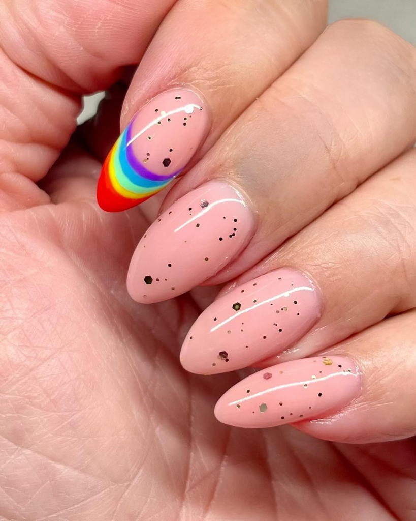 This almond design, which is devoid of any complexities but is not without personality, is a perfect balance of the two. The warm, trendy backdrop of the soft pink being splotched with tiny black and gold flecks is what the nails are made of. A French tip accent nail is the one which has a curved rainbow gradient that gives a total of pride celebration to this nail art. This option is so elegant that it can also be a bit playful. The set complains detailed art lovers but also could be worn during Pride Month and even after that by those who love to make bold statements.