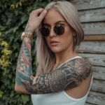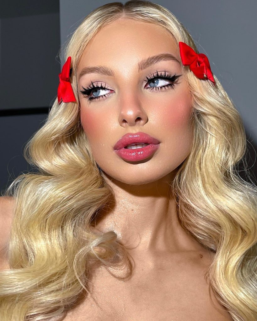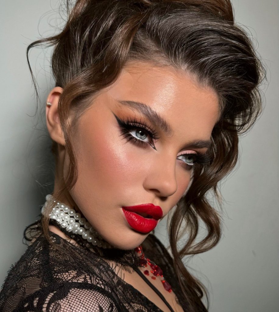 Such a look is a real display of creativity, as it combines black eyeliner shaped like wings with a bright red lipstick for an elegant gothic style. The dark, sharp liner makes the eyes’ blue color pop, whereas the lip color is a very bright, direct choice. This is a fantastic look for a Halloween party, a formal dinner, or a bold evening event that stands out. The style oozes with confidence and glamor.