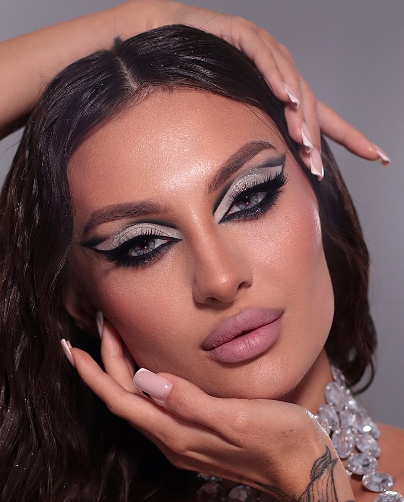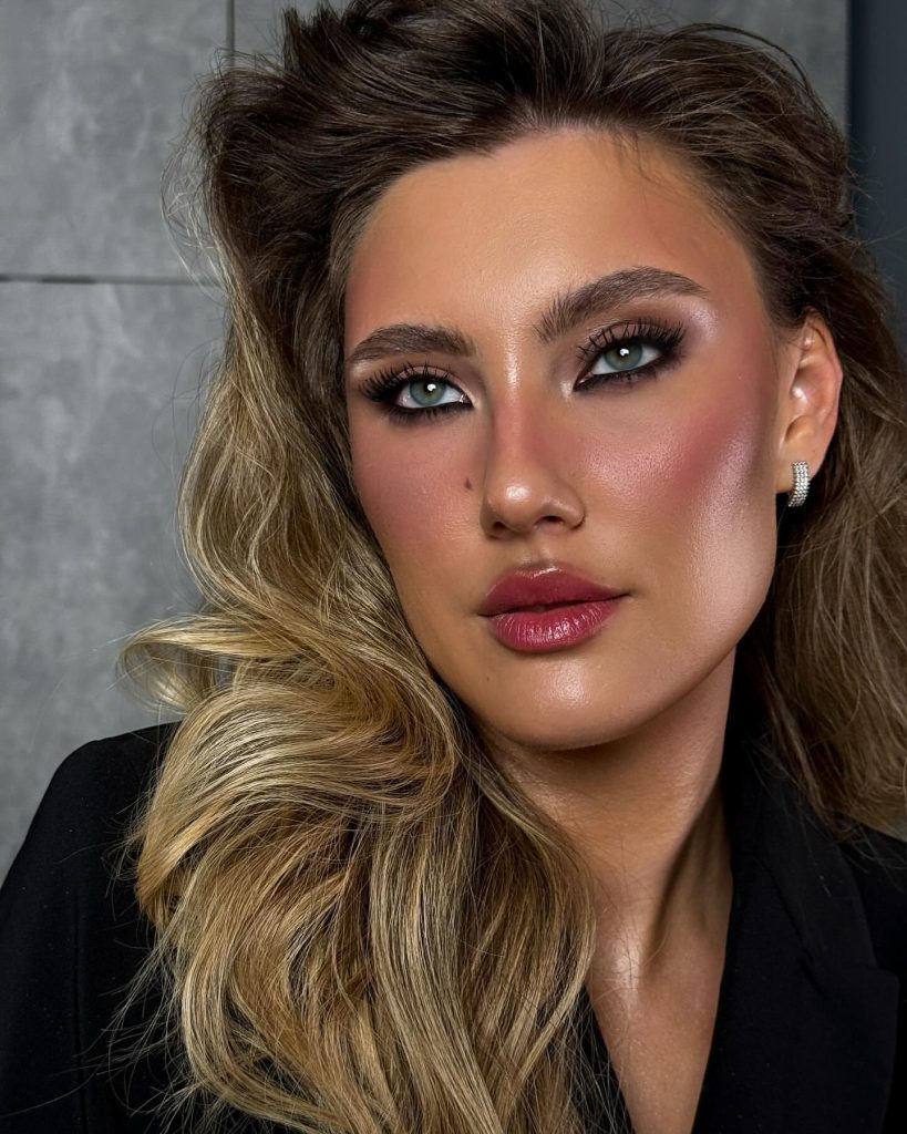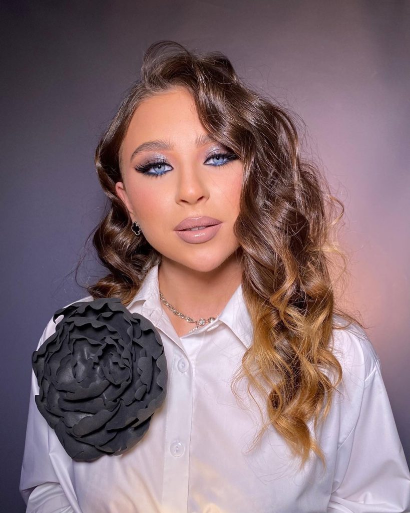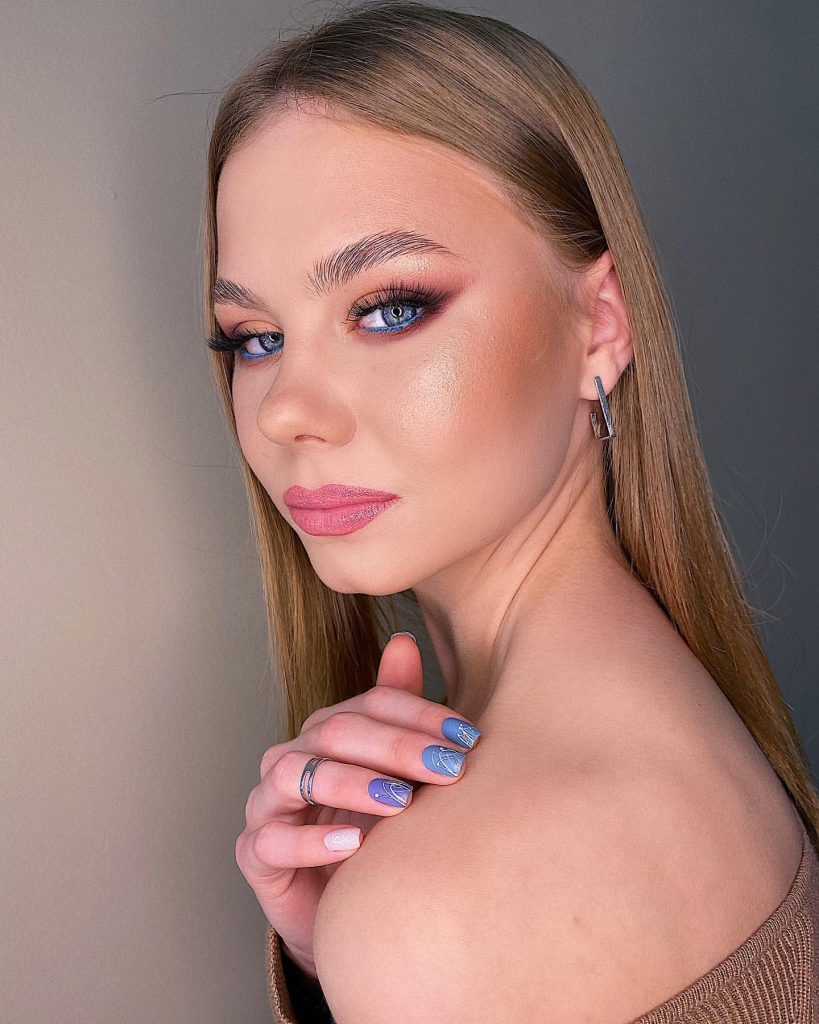An impressive appearance emerges where an icy blue smoky eye prominently incriminates the blue eyes, thus a striking winter inspiration is created. The gradient that goes from deep navy at the outer corners to shimmering silver at the inner corners shows an elegant design for formal events and a breathtaking Christmas party. The hair looks fairly associated with this style, in which it is loose and blonde, as it softens and balances the strong eye makeup.