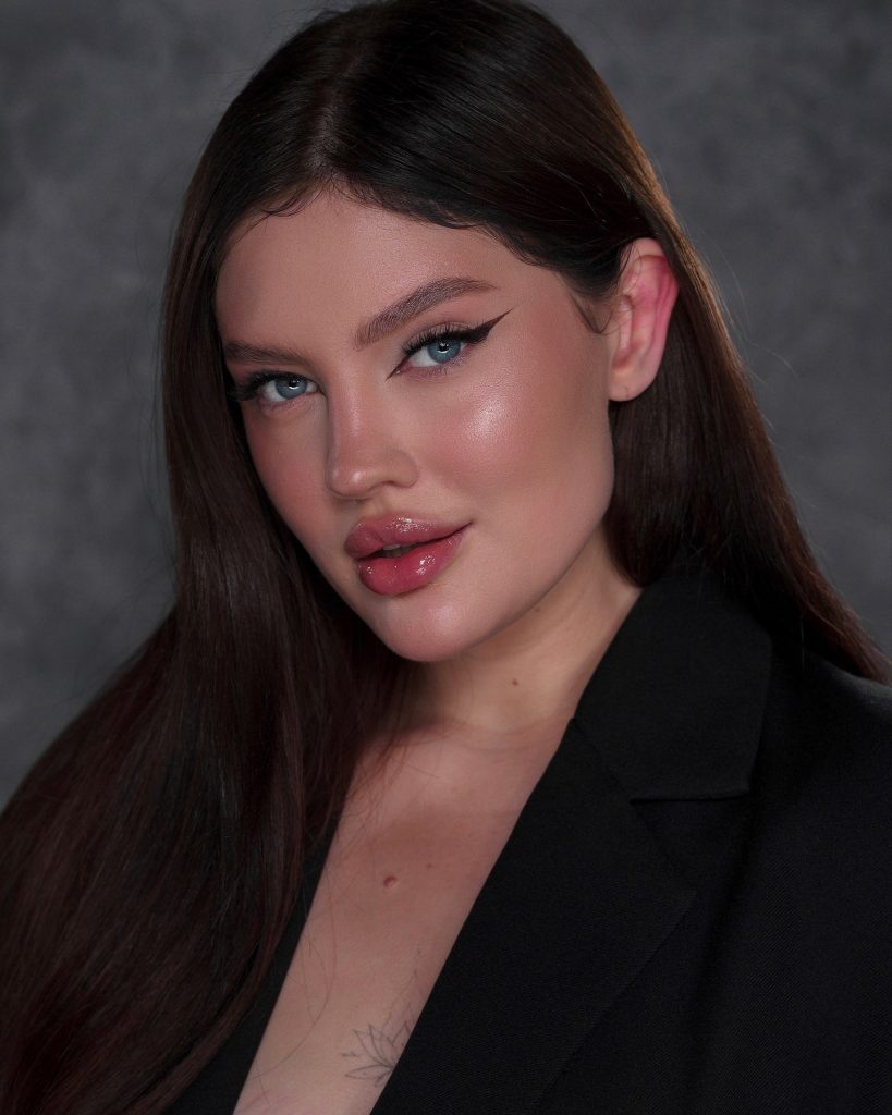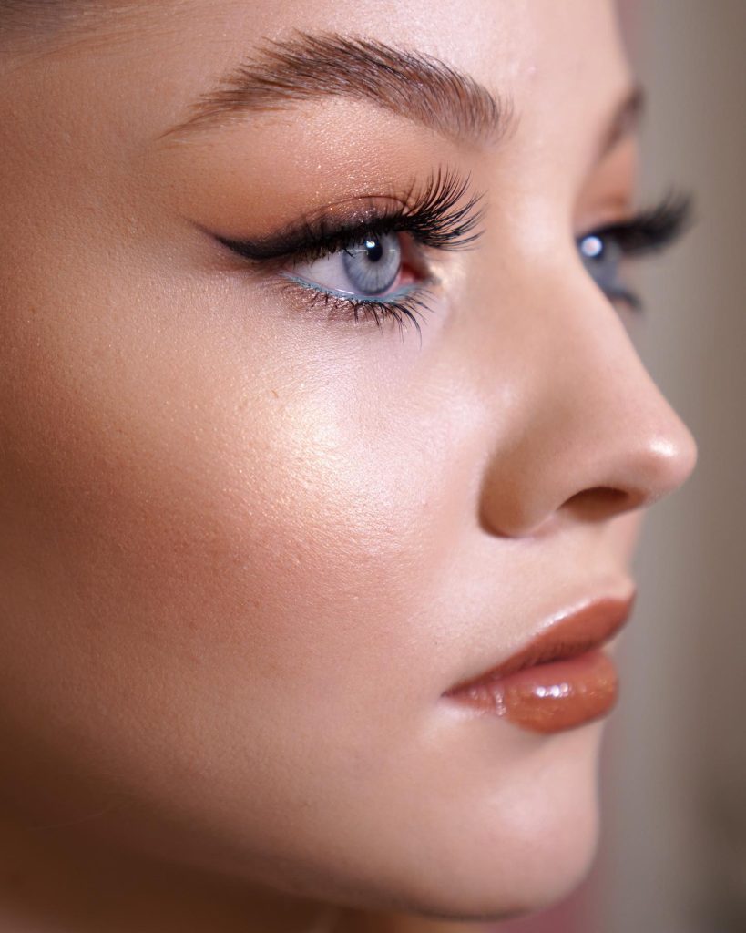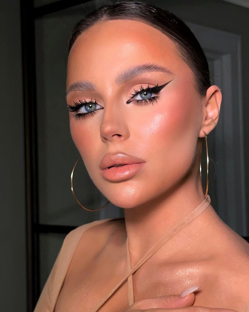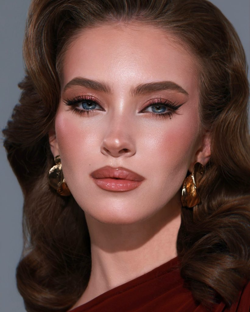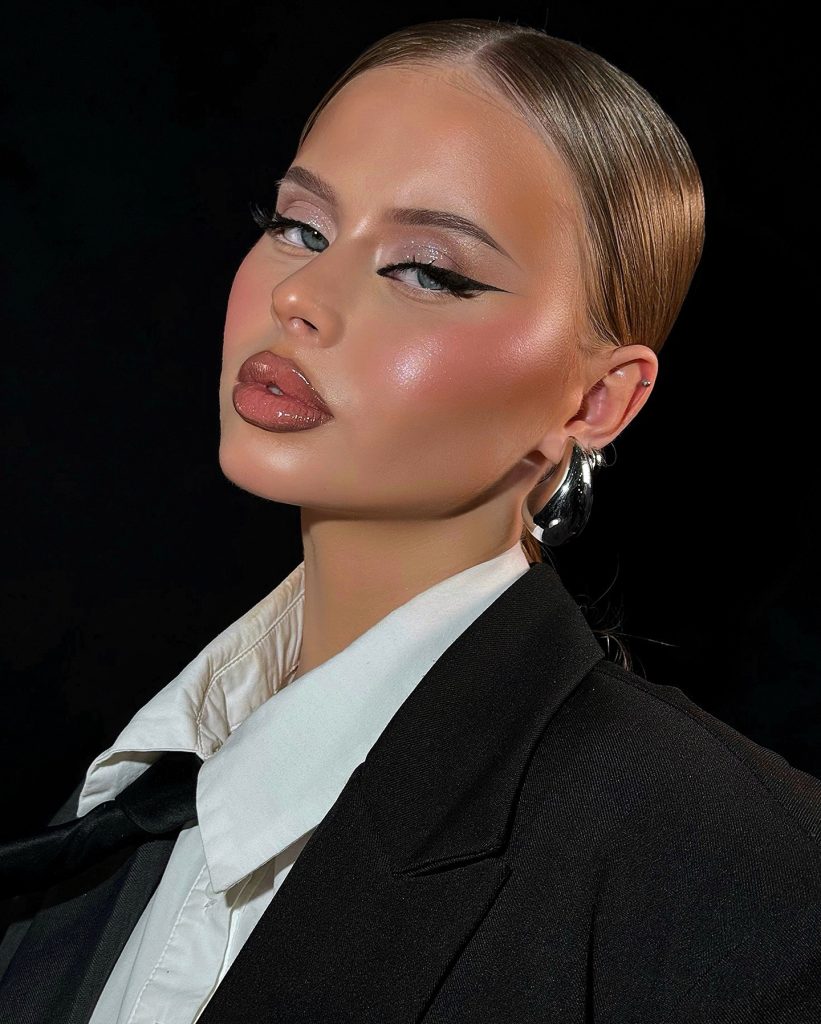 In this riveting appearance, the combination of edgy winged eyeliner and strong sculpted brows is presented with bronzed skin, implying a high degree of self-confidence. The nude lip set in matte lays down the counterbalance for the quite dramatic look, thus, this style is suitable for formal parties or prom. The clearly defined lines and luminous highlights on the blue eyes brought together a powerful and self-assured look.