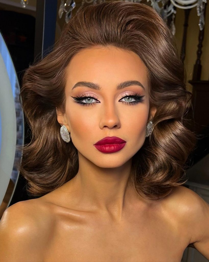 This look exudes vintage charm with bold red lips and soft brown shadow, perfect for formal occasions or a wedding. The eyeshadow subtly complements brown hair, with a slight smoky effect that adds depth to the gaze. This classic style is timeless and particularly suited for a bride or a Valentine’s Day event.