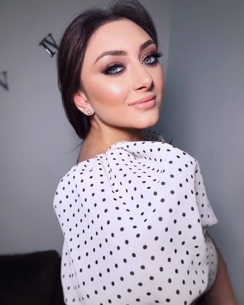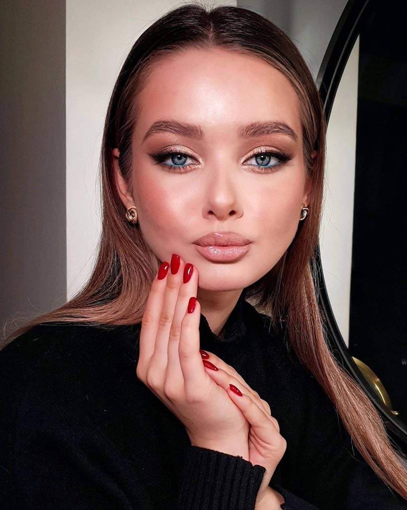 A combination of muted browns with the stunning reflection of golden colors builds a not only elegant but glam look that can be worn to formal events and weddings. The slight reflection enhances the blue eyes, whereas the glossy peach lip gives a hot and a bit of cold feel at the same time. This style, the brown-haired females would love the most, is the best option for her since it goes with the general softness of the look very well.