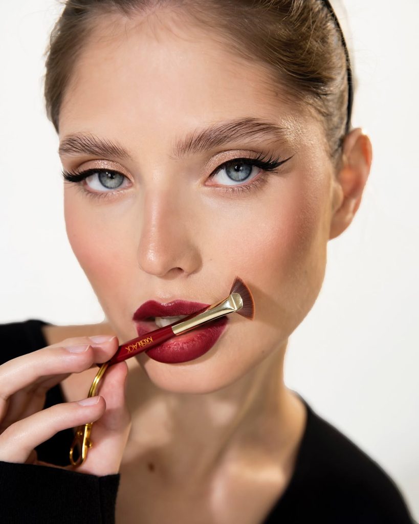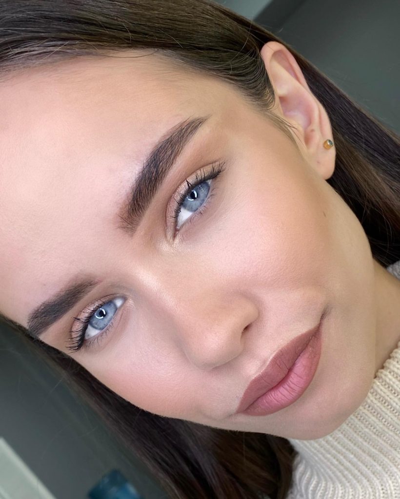 With warm bronze shades, blue eyes are emphasized in a very natural way by this look. The slight lustrous effect created at the eyelids pairs beautifully with blonde hair or brown hair, thus, it is suitable for both a formal event and a fashionable autumn outing. A gentle, moisturized base, and well-groomed brows blending with the idea of sophistication, which is just right for those women who want to appear neat, but with no effort on that.