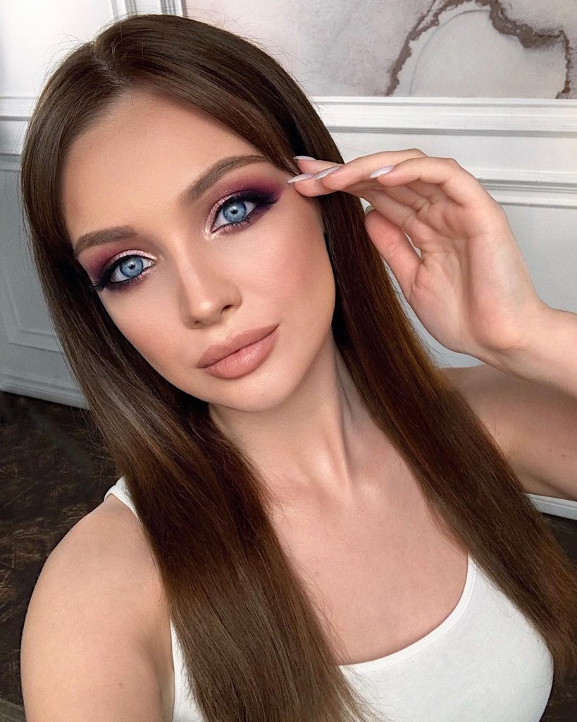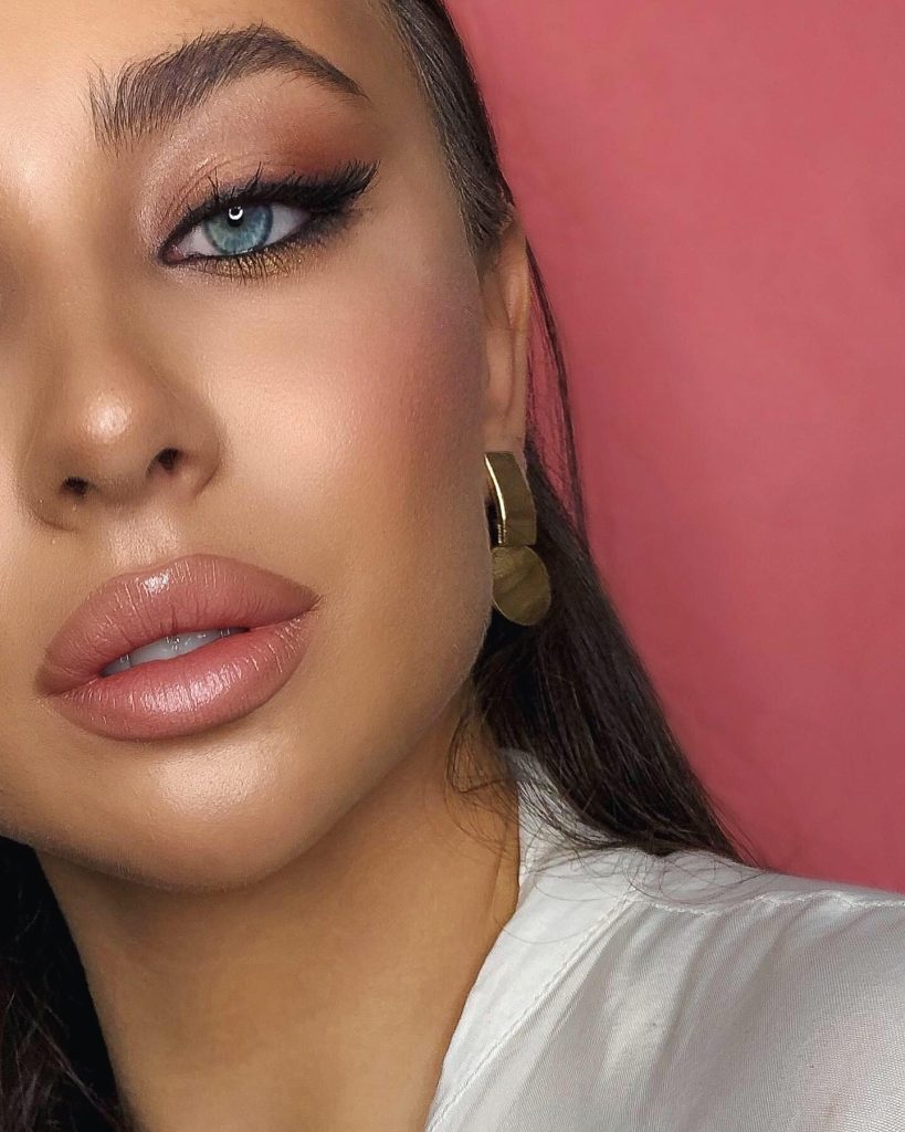 This classic arrangement is characterized by the use of gentle smoky the shades of taupe and brown, which are the perfect details to accentuate and not to overshadow blue eye color. The addition of a glossy shine nude lip and obviously radiant skin makes this pattern detachable for day and night events, too. Definitely, this idea can be used at fall celebrations also, or be an absolutely chic bride’s style.