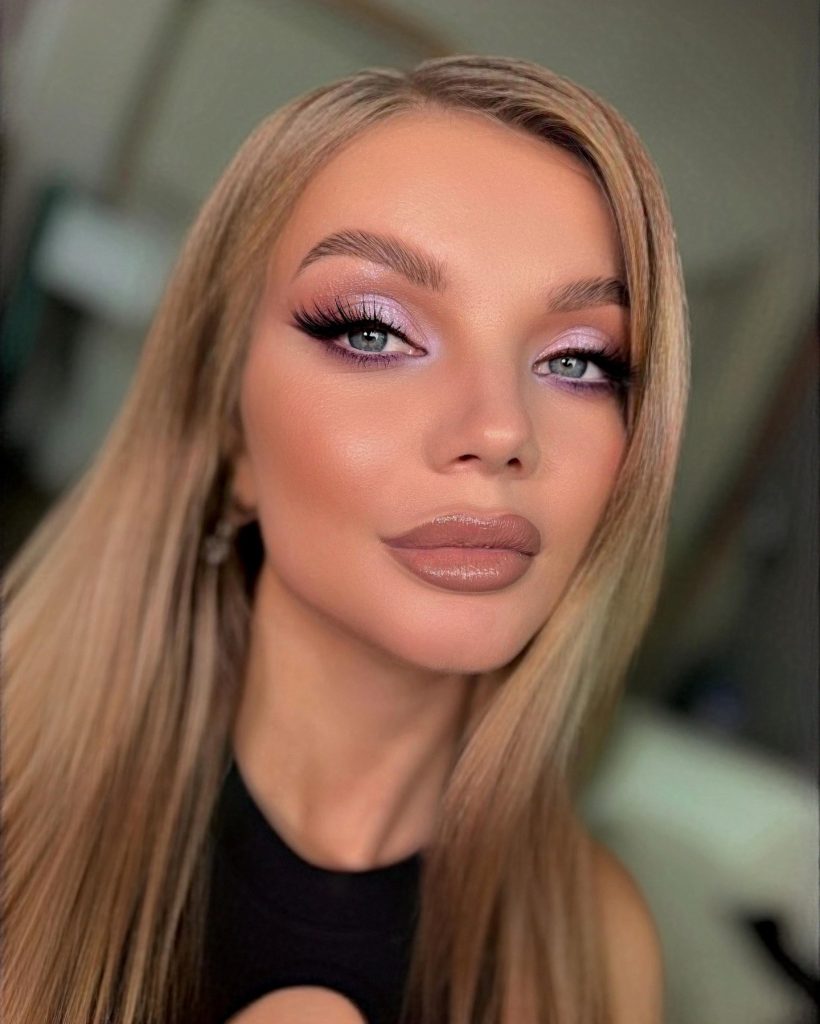 The dreamy and romantic vibe that is ideal for Valentine’s Day or special springtime events will be created by soft lilac and lavender shades applied on the lids that will blend with each other. The hairstyle that blends with this look is the one with the blond hair that is straight and smooth, which will give a gentle yet elegant look to the girl. The inclusion of long lashes and a glossy nude lip completes the look for a feminine, glowing finish.
