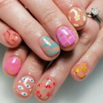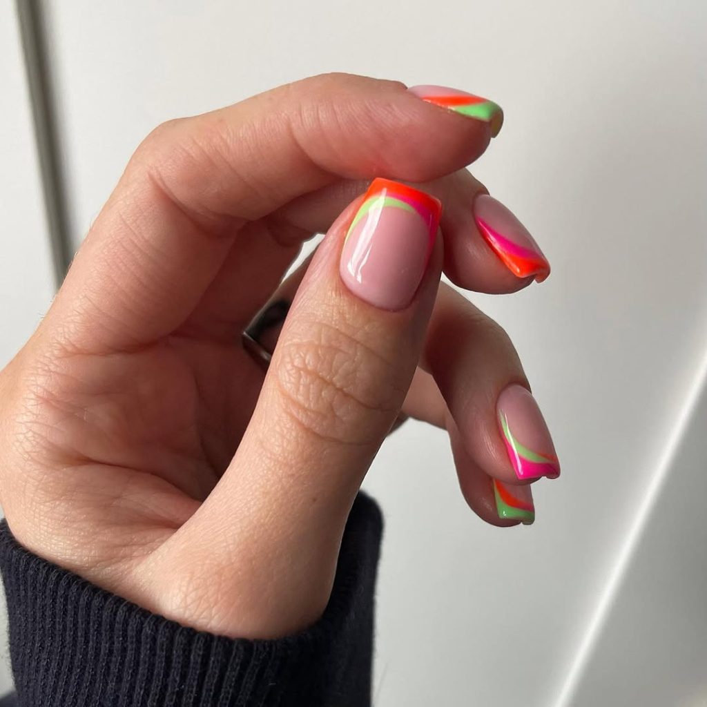 For lovers of bold, artistic styles, this fun manicure combines vibrant colors with curvy movement. The square, short nails feature a combination of French tips that include hot pink alongside orange and green and yellow in wavy bands. Summer 2025 sees neon contrasting with nude bases as the youthful and energetic nail design for the season. Great for festivals, pool parties or just to add some playful energy to your everyday outfits.