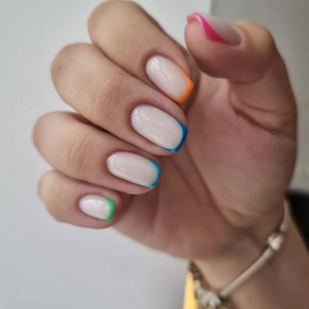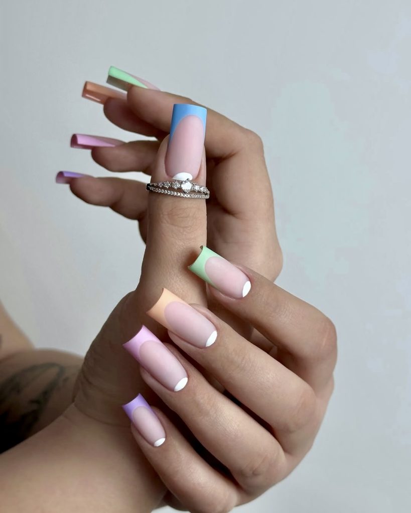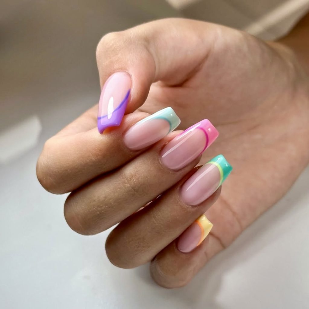 32. Pastel rainbow French tips with a curve