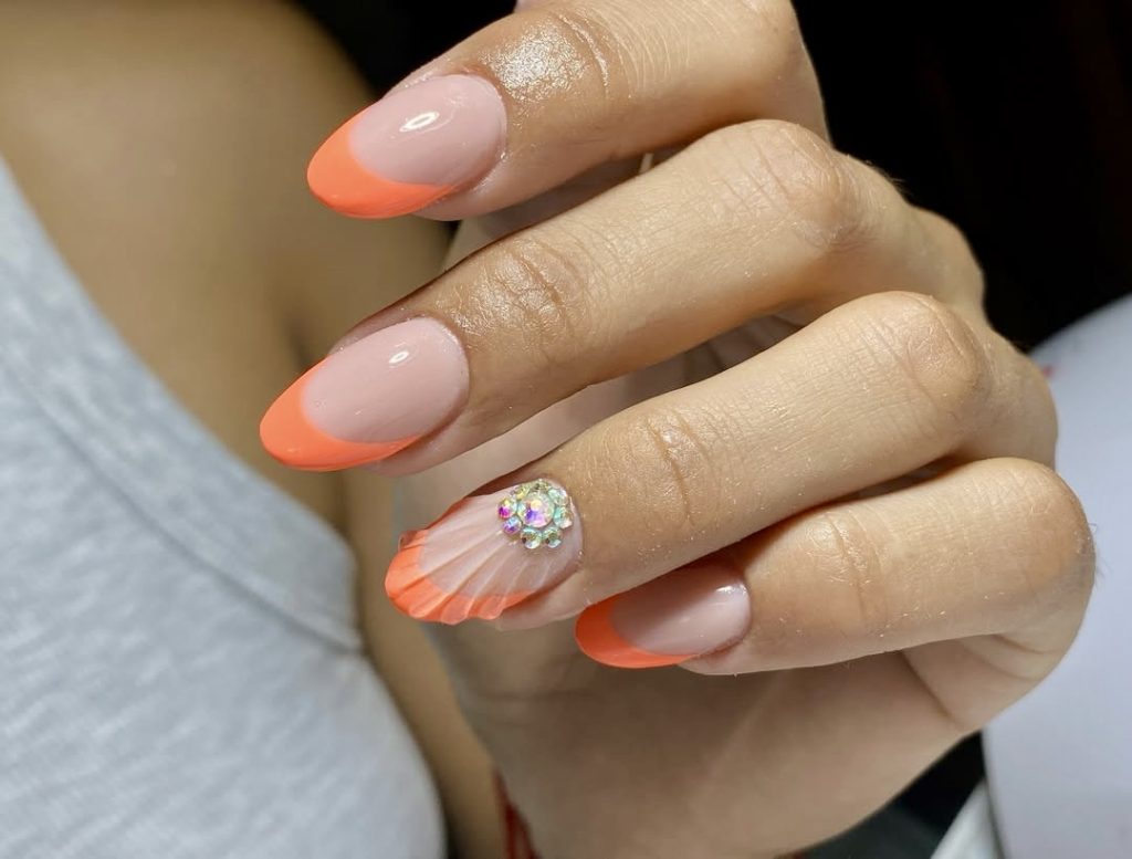 Vibrant and textured, this short oval nail look features a bright coral French tip that screams summer. This design features an accent nail with both an ocean-inspired 3D shell texture and a glittering rhinestone cluster that blends nautical elements with luxurious glamour. The design remains accessible through its semi-gloss nude base. This look captures the essence of a beach getaway – sun-drenched days and glamorous summer nights.