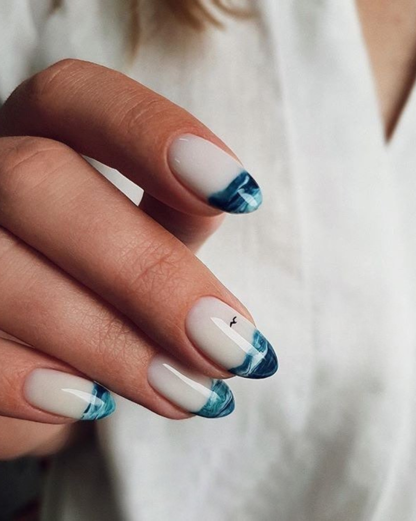 This dreamy set channels the rhythm of the sea with blue marble-like French tips on a nude base. Following the almond shape of the tips, the hands appear more graceful and natural, while the watery fluid texture provides a soothing and calming sensation on the skin. A tiny black seagull pattern adds a magical touch to the design. It’s a perfect nod to coastal escapes and beach vacations – one of the most effortlessly chic ideas for summer 2025.