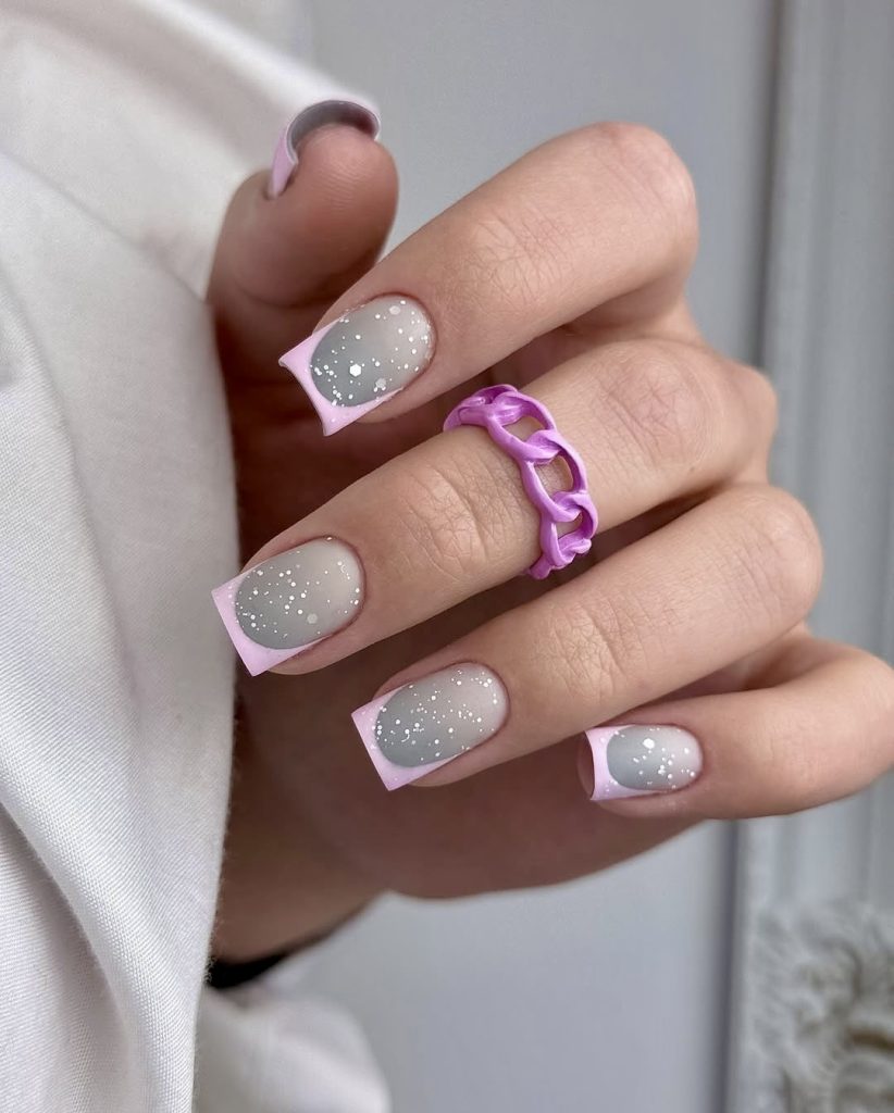 Unexpected and fun, this look combines dusty lavender square French tips with a speckled snow globe effect on a neutral base. This manicure achieves both cosmic elegance and artistic beauty. The confetti-like appearance in the design creates a playful touch, but the soft pink accent on the tips maintains its feminine quality. Whether you’re heading to a rooftop party or grabbing an iced coffee with friends, this design is trendy, stylish and unapologetically bold.