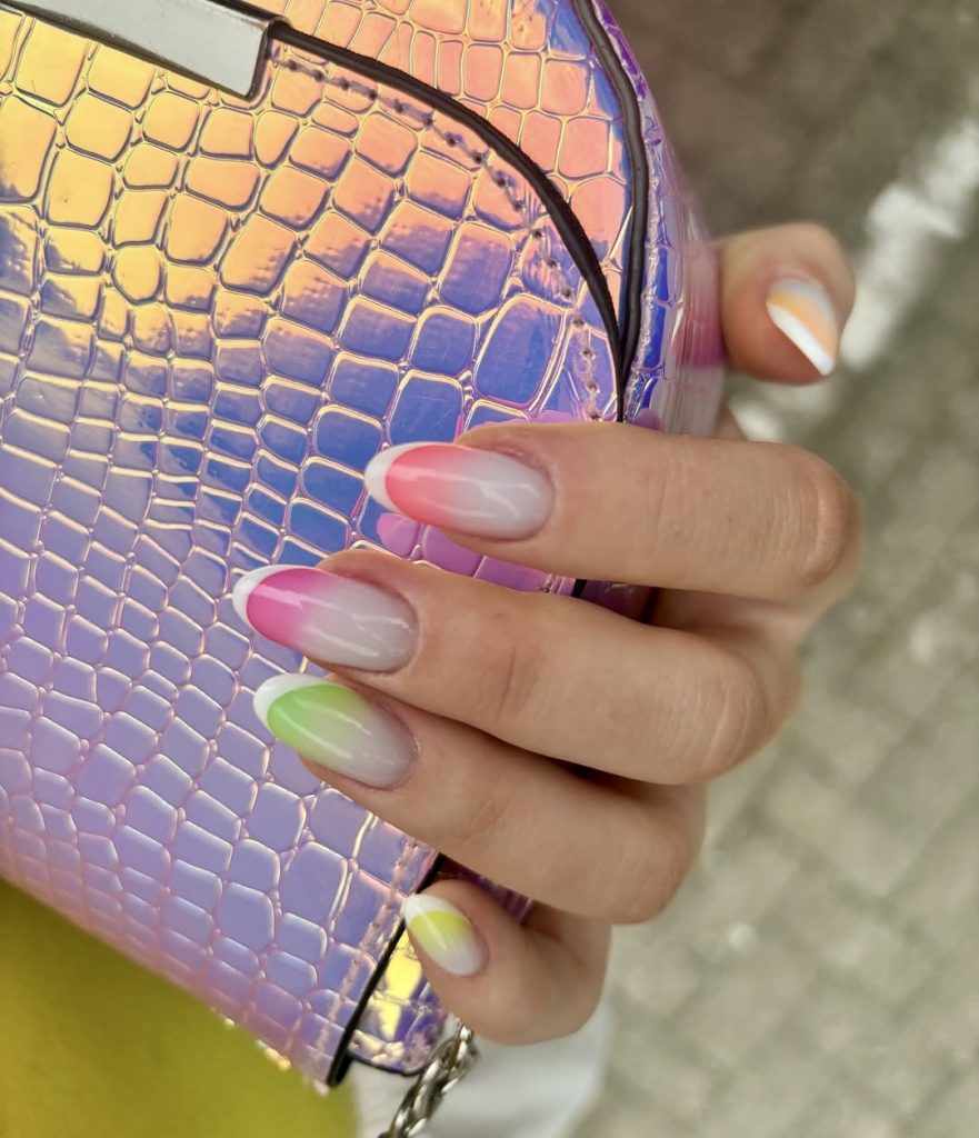 This almond-shaped set brings a dreamy twist to the French Tip trend with gradient pastel shades of pink, green and yellow, all finished with a crisp white outline. The soft ombre technique develops a delicate airbrushed look that is suitable for evening beach dinners, wedding ceremonies under the garden trees and summer walks. It’s a versatile idea that balances creativity with elegance, offering something different while staying true to classic charm.