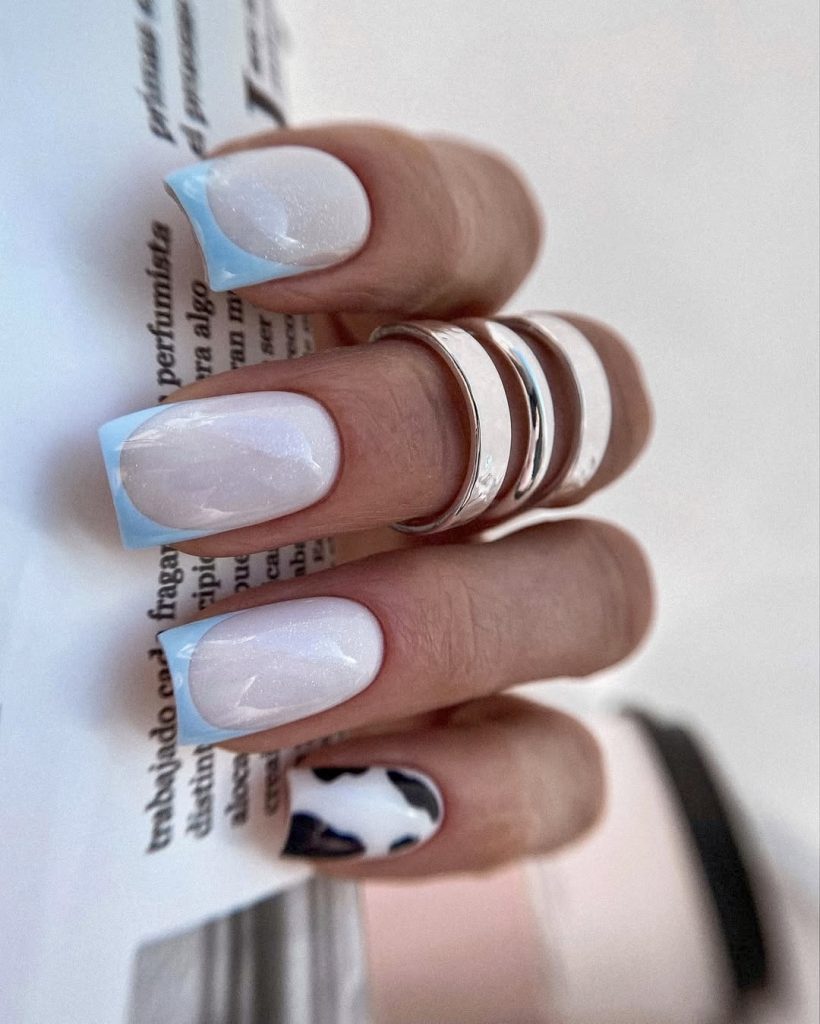 This square blue design features a unique mix of cool tones and edgy details. This design combines metallic white shimmer on all nails with icy blue French tips, but stands out because of the cow print accent nail. Bold and new, this design is for women who like to take fashion risks because it has a contemporary appeal. It’s the perfect way to add some unexpected flair to your 2025 nail routine.