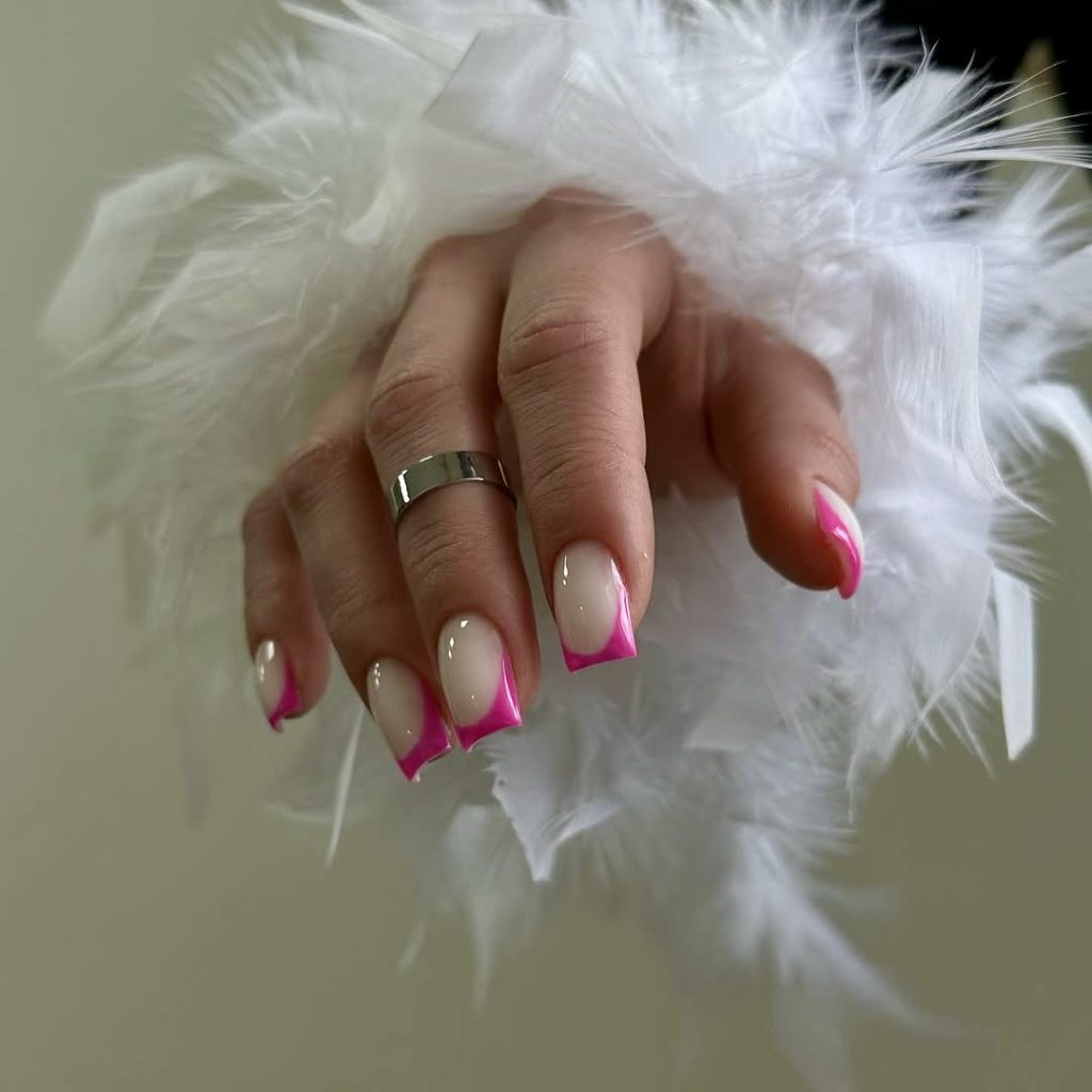When you’re craving something sweet yet fashion-forward, this manicure delivers. A stylish design applies defined pink French tips over a neutral cream base to create a textured look with detailed architectural vibes. The glossy finish brings out the vibrant color, while the square edges create a flexible look that makes it suitable for everyday wear. It’s a style that transitions effortlessly from day to night-ideal for brunch dates, beach parties, or sunset cocktails.