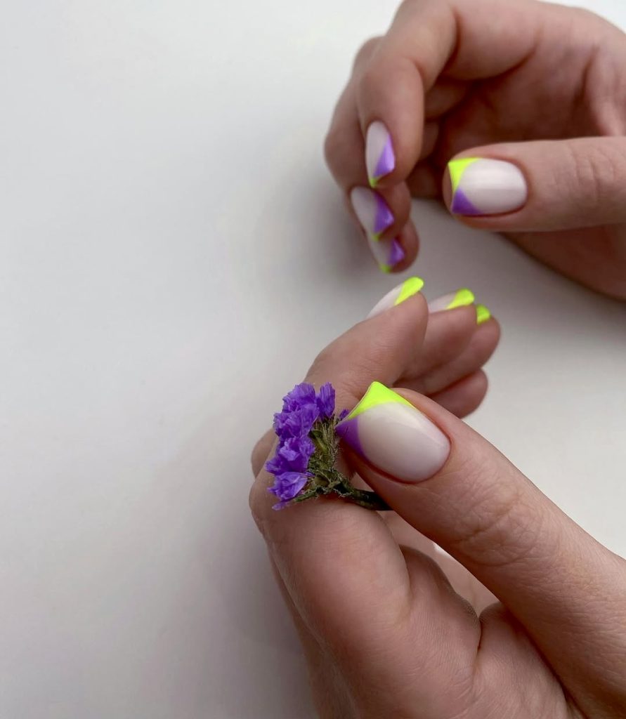 For a geometric twist on summer nails, this edgy set features a bold neon and lavender color block French in a sleek diagonal pattern. The square nails feature artistic color contrasts along with perfect symmetry that artfully combines yellow with purple elements. It’s a great way to explore the artistic side of French tips while keeping things structured and wearable.
