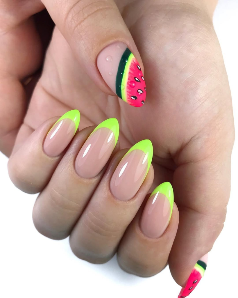 31. Neon almond with watermelon accent