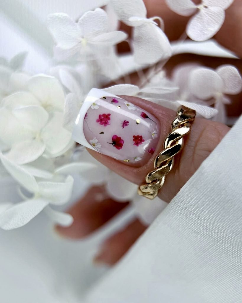 33. White French tips with floral accents