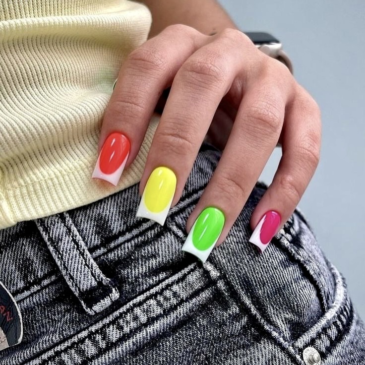 This bold look features square, short nails in solid, vibrant colors – red, yellow, green and pink – framed by bright white French tips. The style combines bright, bold colors with simple graphic lines, creating a fun summer fashion for women who enjoy mixing vibrant hues with crisp geometric designs. The square white lace adds a fresh texture to the palette, making it one of the trendiest ideas for 2025.