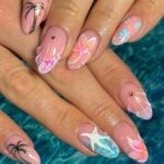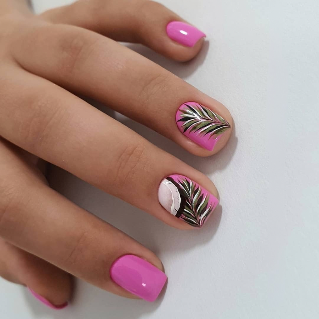 This look is like a palm vacation for your fingers! The design consists of pink nails that are soft with palm leaves that are hand-drawn; it would make you feel like you are in a tropical paradise. It is simple and elegant enough to wear every day but still fun and spontaneous for a weekend trip. The idea is just right for the light skin tones to add some tropical charm without looking too much. This pretty thought would look excellent with a breathable maxi dress and espadrilles for a carefree trendy summer feeling.