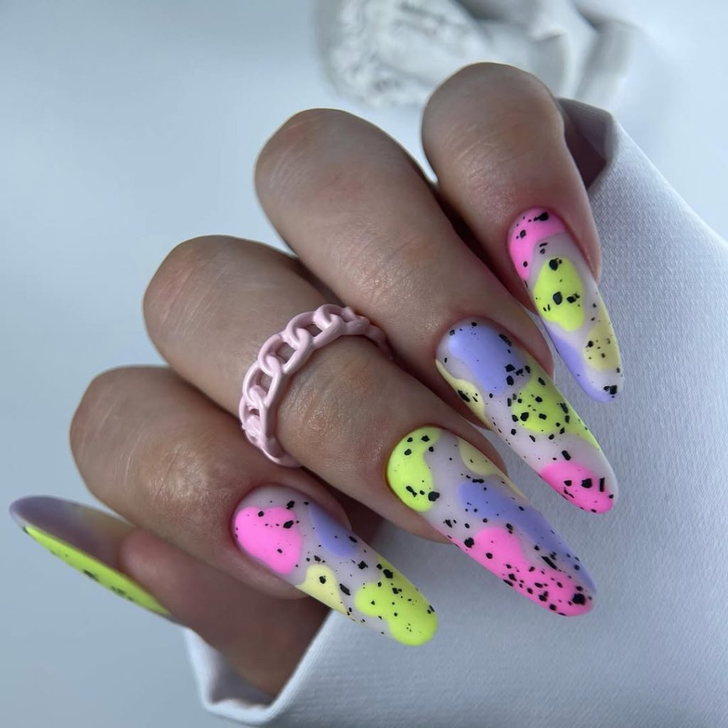 If you want to be hot and bold this summer, this style is the one for you! This look consists of a vibrant neon yellow, pink, and purple, which are softened with a matte finish and set in motion with a few edgy black speckles. It is an ingeniously youthful yet trendy mix. Terrific nails for ladies who want them to be both a fashion statement and a conversation starter. These nails are so beautiful on brown skin and dark skin they even make the colors stand out more. For better effect, combine this look with colorful accessories.