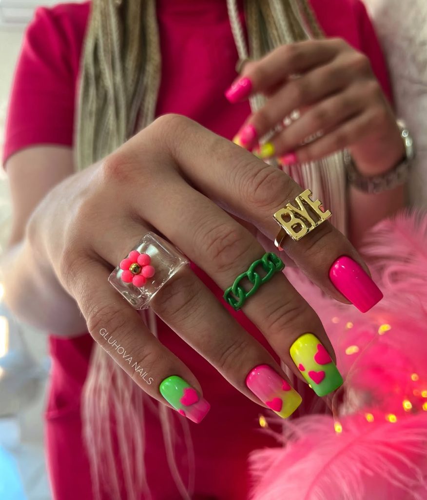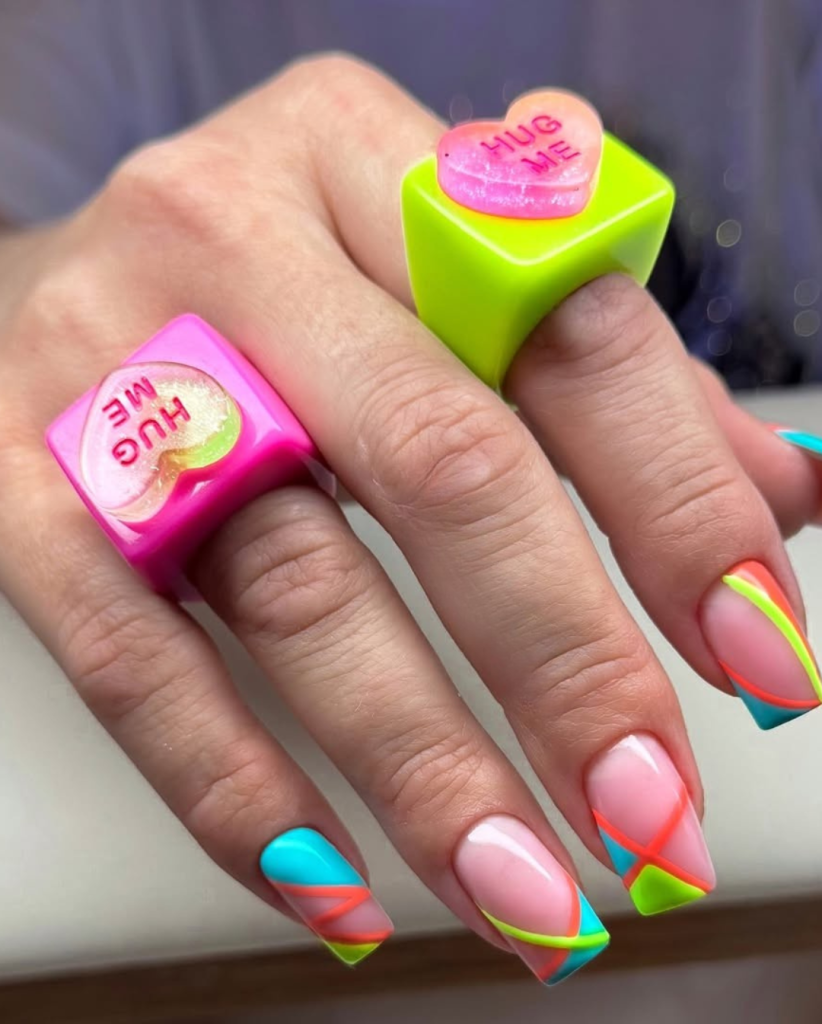 The few that are more summer than this funky mix of neon pinks, greens, and yellows, heart embellishments are right. Bright and trendy art style 90’s energies make it now a real necessity for pool parties or music festivals. The square design is really nice because the colors stand out so vividly toany complexion, and the square is a reference to the trending 2025 nail aesthetics. This manicure will be your best friend if you wear bright colored block outfits or neon accessories this season.