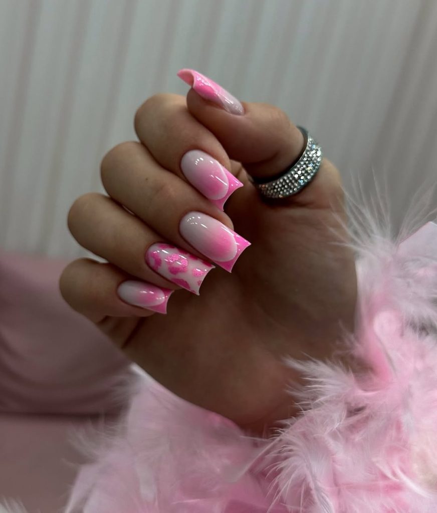 This manicure turns out to be a perfect choice for those who desire a simply elegant style with a lovely twist. The classic model of French tips is modernized with bright pink miniature color marks and it is combined with a soft gradient. The playful pop of a floral design pattern on an accent nail brings just the right amount of charm to make it feel brand new and trendy for the year 2025. It is an excellent alternative to women who have pale skin and love to wear light and breezy clothes during summer. This design works very well with linen dresses and pastel sets—definitely a summer essential!