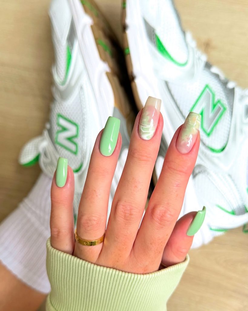This style is a perfect example of the new minimalist form. A solid creamy light mint green, paired with two fingers featuring a delicate marble design, results in an ultra-chic contrast. This sporty yet elevated gel manicure is ideal for a casual or sporty look, especially when paired with sneakers or a light tracksuit. Should you be the type of person who is into that easy feeling, then, yes, this is a hot trend that you are likely to find everywhere in 2025. It is the type of manicure that is very much durable but with a simple appearance, which is a great choice for summer events.