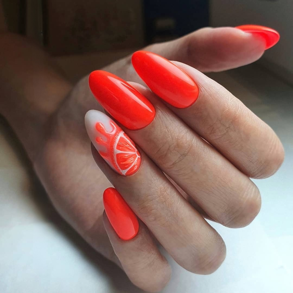 Whenever you think of summer, the first thing that comes to your mind are fruits such as citrus and watermelon. Likewise, the idea of a bright orange gel with a hand-painted grapefruit slice is the best possible manifestation of the season. The fresh orange color sets the stage for a daring statement, and the artistic accent of the nail makes it uniquely pretty and playful, which is perfect for summer. This layed-out style appears cheekily on bright sunny pool days or cocktail-drinking time on tropical vacations, thus translating a feeling of youthfulness and energy. It is great not only for brown and dark skin but also for a wide range of skin tones, which makes it the second most favorite item for 2025.