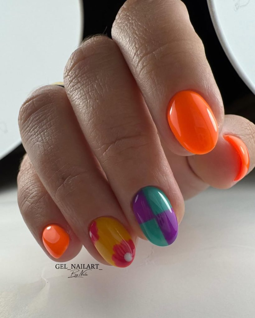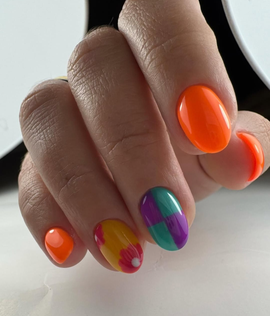Electric orange and punchy pink, deep purple and blue come together in this vivid floral-blocked design. Each nail is like a mini plot of a nail from tropical flowers to checkerboard patterns. This set is a typical representation of summer festival style and has a strong Y2K influence with the cartoonish color blocking. ипотек While you are dancing at Coachella or just chilling with iced lattes in the West End, this gel mani is the favorite among influencers. It is designed for short nails and it also goes well with brown skin.