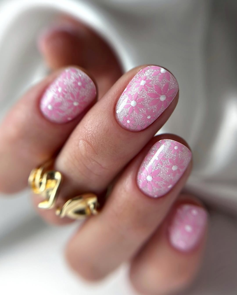 This soft and pretty style makes women dreaming with its combination of grace and a bit of shine. The base is in blush pink and has the pattern of tender white daisies and underlay of shimmery glitter. It is among the most feminine and airy nail designs for 2025 and is the perfect addition to linen sets, silk camis, or pastel two-piece outfits. This look is particularly gorgeous for girls with fair skin and perfectly suiting these who like minimalist beauty trends. A TRUE must-have for weddings, garden brunches, or even your toes if you adore matching details.