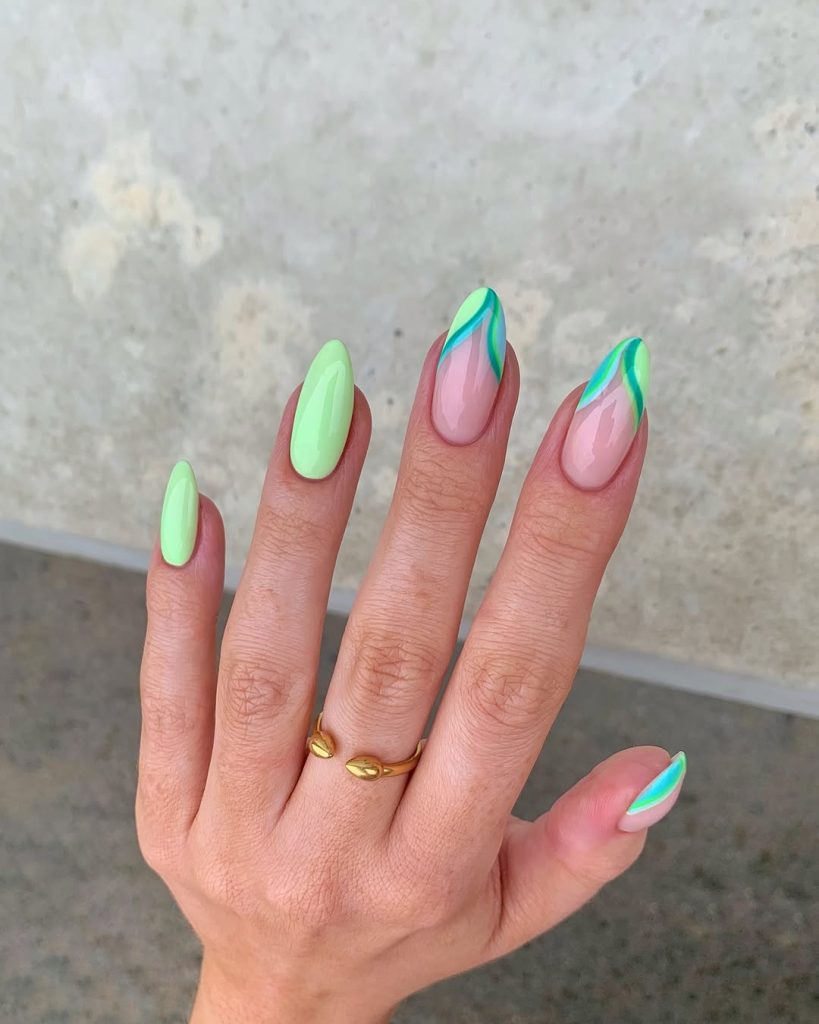 The compendious of casualness and rebelliousness that the nails set brings is; however, the most suitable way to describe this edgy nail kit. It is the almond-cut nails that present the unusual design: some of them being fully painted in green; others, instead, choosing the nude base with layered lighting and dark green and blue devilish lines as a decoration, which seem to be almost like plant perils! The magnificent spectrum of colors in the gel manicure, for example, this one that would be seen on a dull spaceship crew in Miami, would be light-hearted, bold, and not complicated is the type of 2025 gel manicure. Such a design is, indeed, equally perfect for a woman with pale skin as for a woman with brown skin since the nude colors and bright green colors are so relaxed and adaptable.