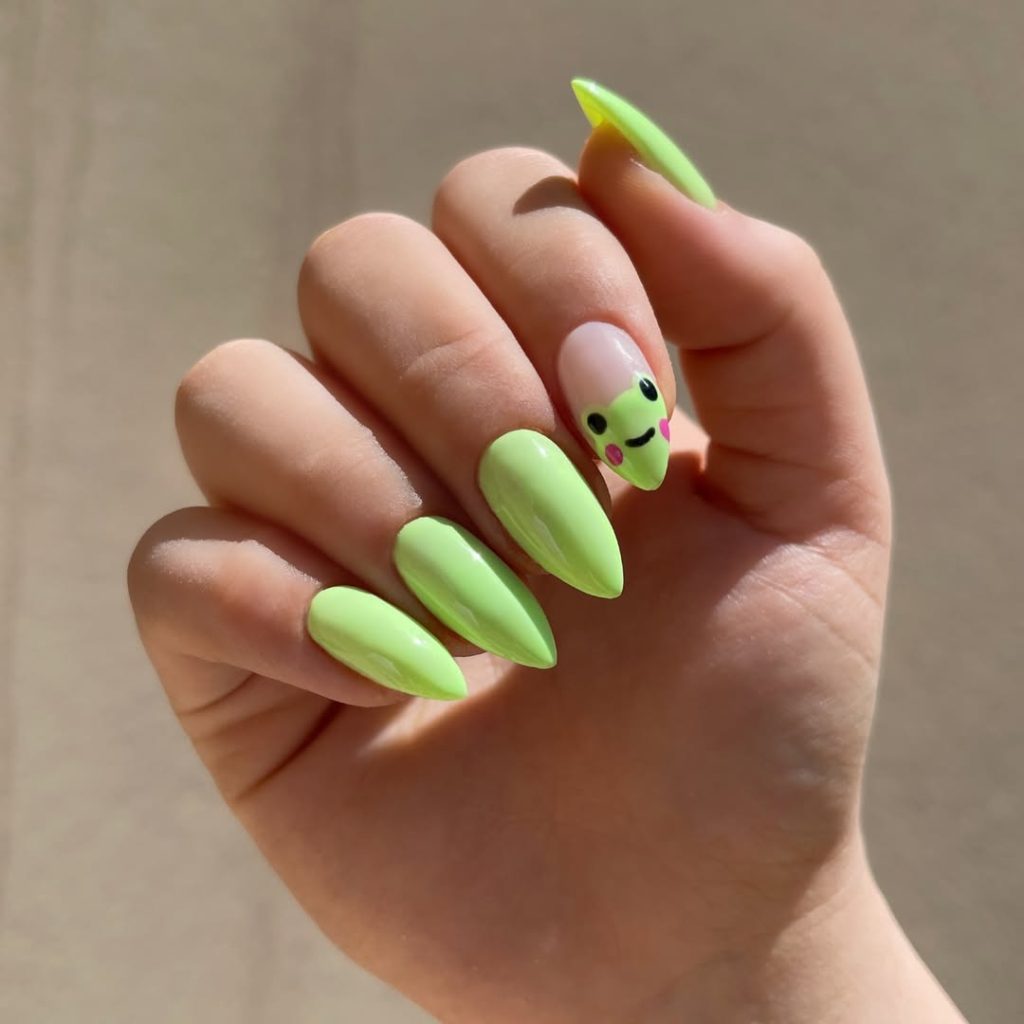 Nobody can remain unhappy with this adorable summertime nail design. The main part of the four nails shines in the glossy liquid of the neon lime, while the accent nail, which is painted in a sheer nude, houses a hand-painted cartoon frog with rosy cheeks. This design is the same as light-hearted; however, it is neat because you can only put one gel. The design looks amazing on individuals with pale skin and is also suitable for short-to-mid-length nails. Be it a road trip or a music festival, these nails pin fun in every aspect but neglected one, which is keeping up the overall look.