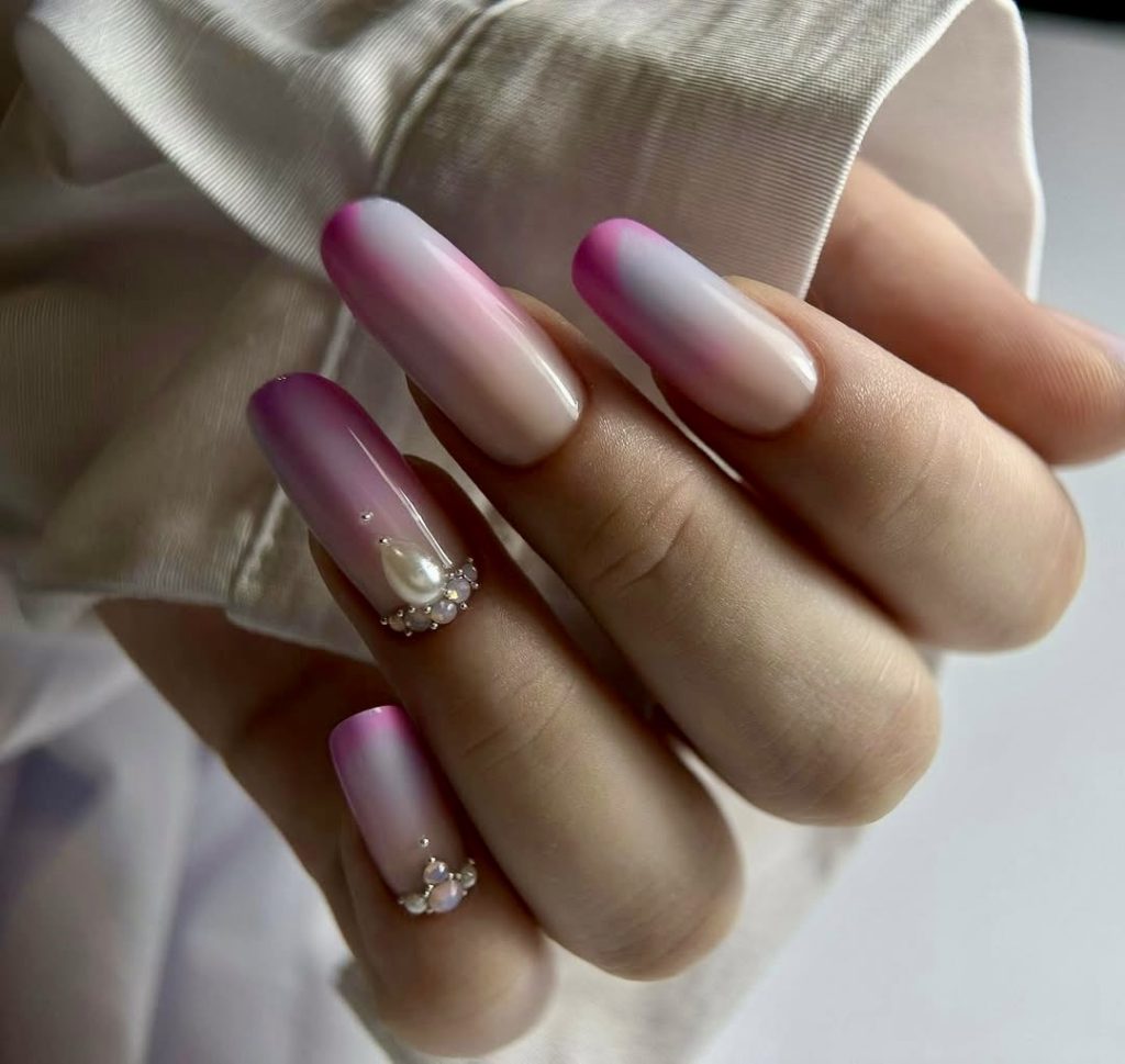 Now let us explore a slightly different style, which carries more of comfort, romance, and beauty. This long nail design is a wonderful combination of a pale pink and pure white ombre that is further improved by the addition of mini subtle 3D pearls and micro rhine stones. The gradient is simple and delicate looking, thus it radiates only a little luxury. Perfect for summer theme parties, it can also be used in various occasions like wedding showers, engagement parties, or simply dressing up because it’s a Thursday in summer. For the 2025 gel dnd, this design is a perfect pick for those who love it pretty without the feeling of too much and the style goes with the pearl accessories perfectly.