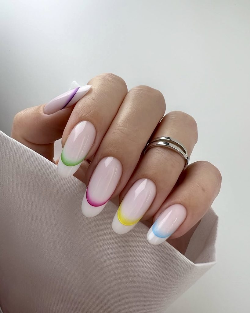 The traditional French manicure undergoes a radical transformation by the use of color blocking in electric blue, neon green, and fiery coral. The application of light nude bases gives the design a pretty and simple look, while the pops of color bring the trendy edge. It is a perfect pattern for short nails, making your hands appear even more graceful. Moreover, it looks great on both pale and brown skin due to the striking contrasts. This style is ideal for casual daytime parties as well as late-night cocktails and is a great addition to any 2025 fashion-forward wardrobe.