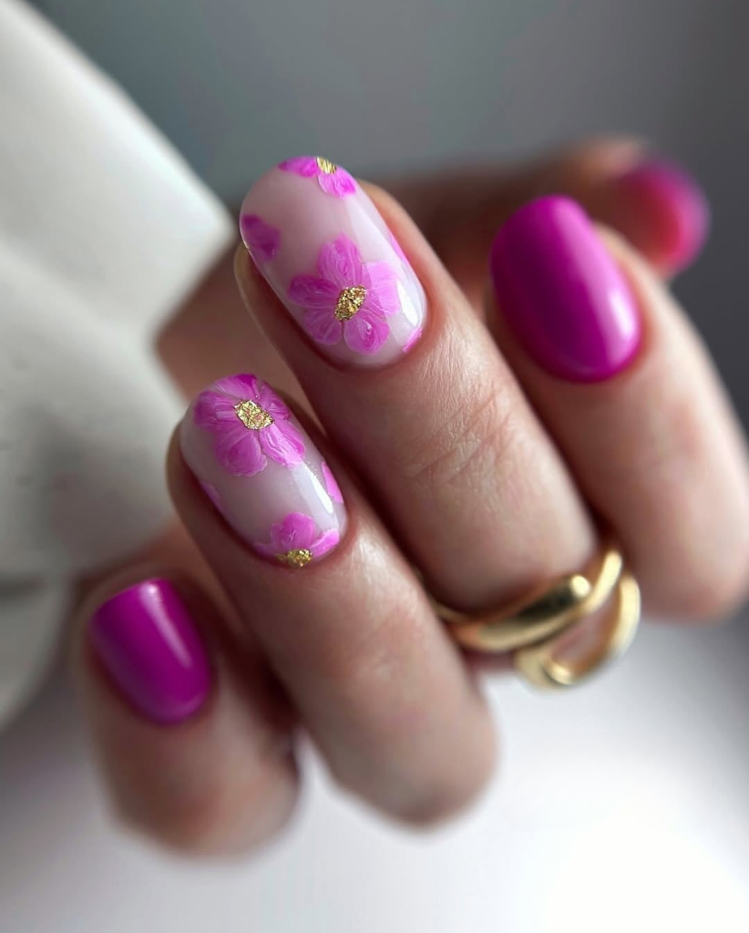 Channeling the joyful energy of a field of wildflowers, this manicure features vibrant pink nails with intricate floral detailing in pink, red, blue, and white on two accent nails. The bright color palette makes it perfect for summertime celebrations, from backyard barbecues to music festivals. The crisp dot accents keep the design playful but organized, making it feel both simple and elevated. Whether you opt for 2025 gel or 2025 dip, this style is made for women who want their hands to bloom with color.