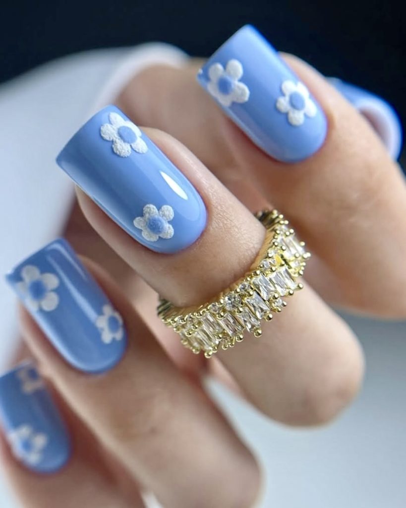 Calm your heated summer days with the blue nails which look just like peering into the deep ocean. The little daisy pattern made as raised white texture seem so minimalist and are amid the light blue shade, it is like adding a cherry on the cake. White in this case works for daisy, in the raised texture mechanism. 2025 will be the time when this design will be quite trendy. It́s easy to use, elegant, and popular among trendy designs. This one is particularly suitable for pale skin and can also be used for the toes; for example, in the case you are a fan of matching mani-pedis.