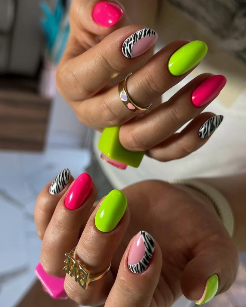 Are you an attention seeker? Definately need to 2025 to neon green and hot pink mingled with zebra stripes’ alternating pattern. The unexpected twist? A soft pink base with zebra crescents that join the whole look. It is really hot, expressive, and also a great option of 2025 gel dnd set. This style of nails is perfect for brown skin because of the hard contrast of neon against warm undertones.
