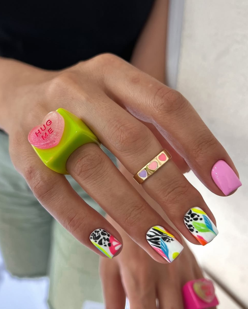 This punchy square nail set unites all the imaginable summer design ideas and includes bright shades of colors, black-and-white animal prints, and slick gel polish finishes. It is a stylishly eccentric way to express your lively personality and is suitable for both dark and pale skin. The contemporary styling of patterns communicationally says it—just like you would see in a runway-led 2025 manicure