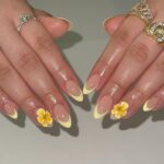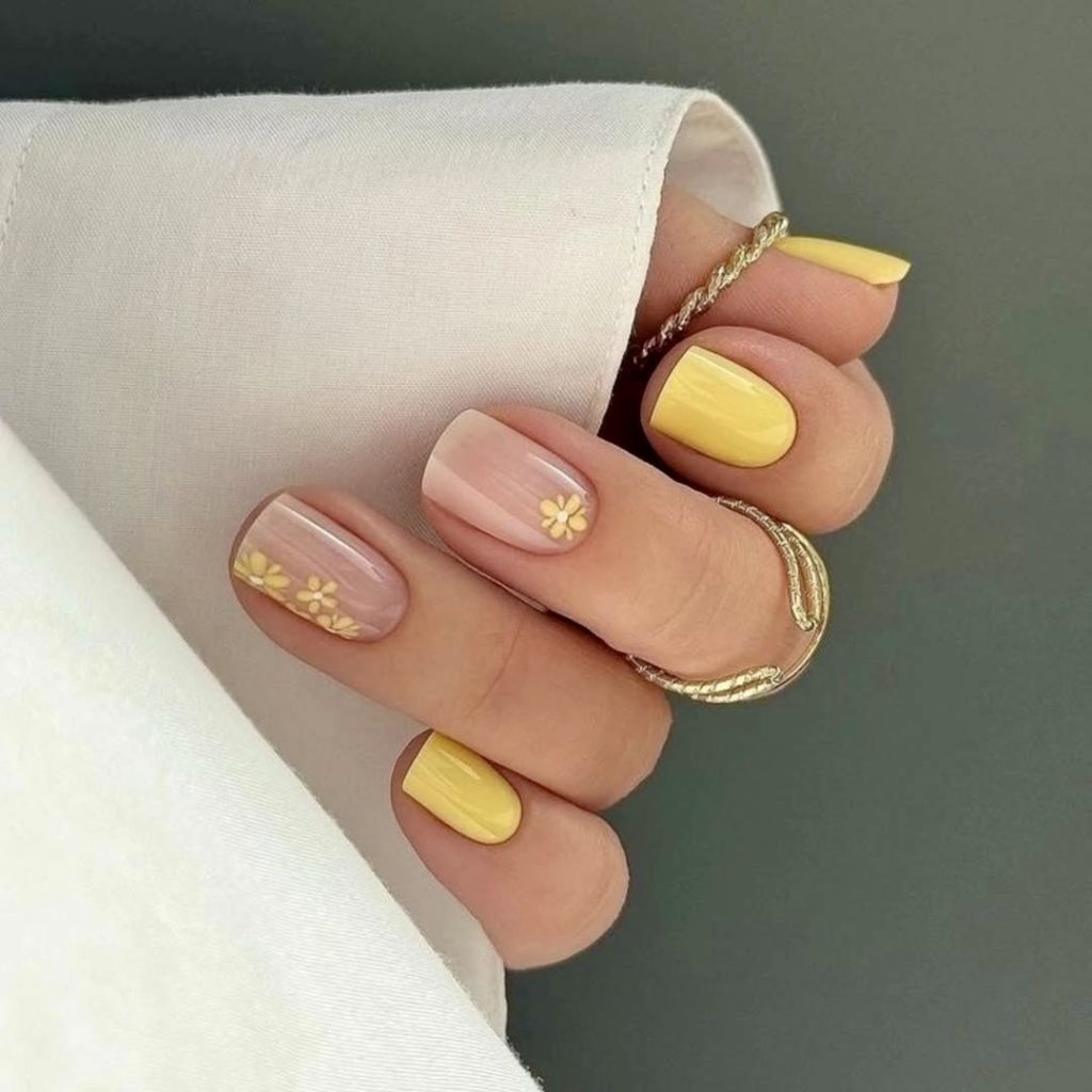 Subtle yet absolutely cute, this short nail design features alternating shiny yellow polish and transparent bases adorned with tiny yellow flowers. People can wear this design with ease as it creates a charming look perfect for weekend getaways and casual brunches. This nail design effectively combines both the almond short simple look of 2025 and seasonal fresh aspects with sunny friendly feelings. If you’re looking for something simple yet uplifting, this floral idea is a top pick.